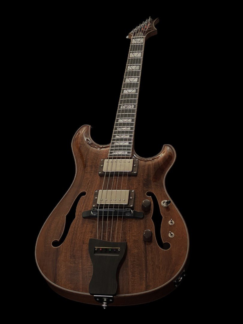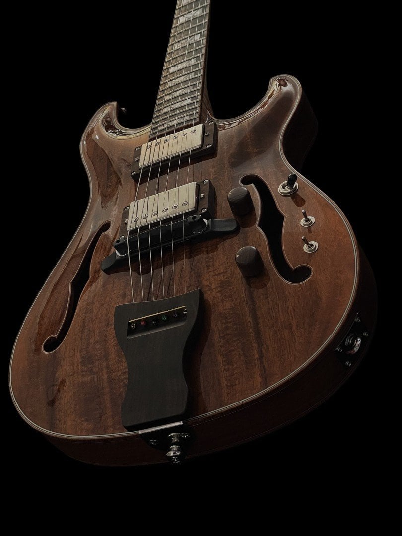 Premium hardware throughout enhances both performance and reliability. GraphTech Ratio locking tuners provide precise tuning control, while the GraphTech ResoMax archtop bridge supports sustain and resonance. A custom archtop wood tailpiece completes the design, maintaining a lightweight feel that complements the fully hollow construction.