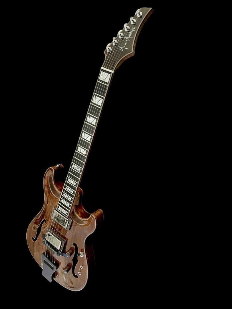 The Maxey Archtops GH1 Koa is a 13 inch fully hollow archtop crafted entirely from hand carved koa using traditional archtop construction methods. Featuring a three piece maple neck, 24 fret extended range, Seymour Duncan โ59 pickups with series, split, and parallel switching, and premium GraphTech hardware, the GH1 Koa delivers articulate tone, dynamic response, and elegant visual character in a compact archtop design.