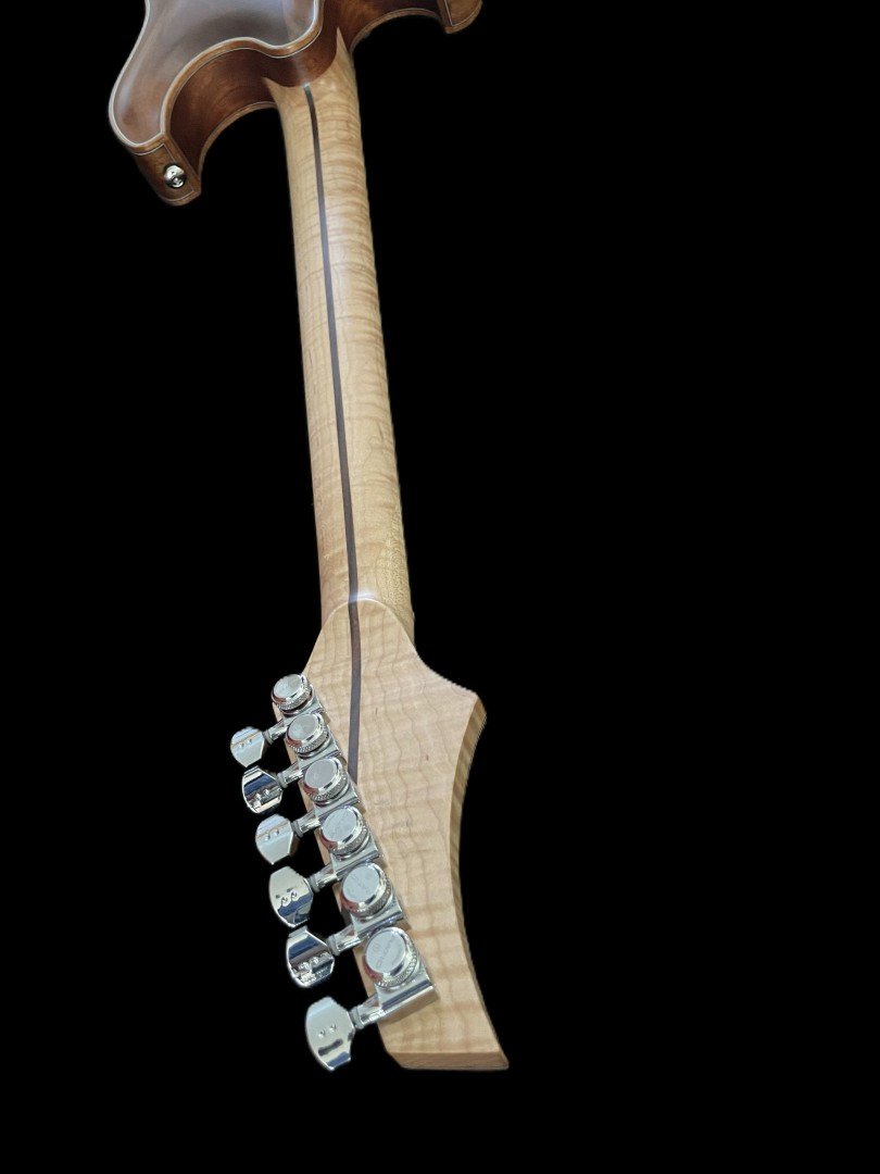 A three piece maple neck with a center lamination provides strength, stability, and consistent response along the full 25.5 inch scale length. The ebony fretboard, paired with mother of pearl inlays, offers a smooth playing surface and clear visual reference.