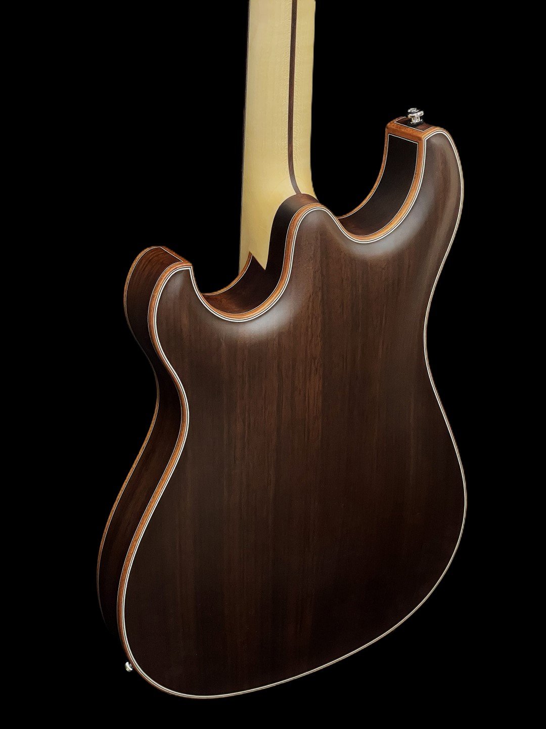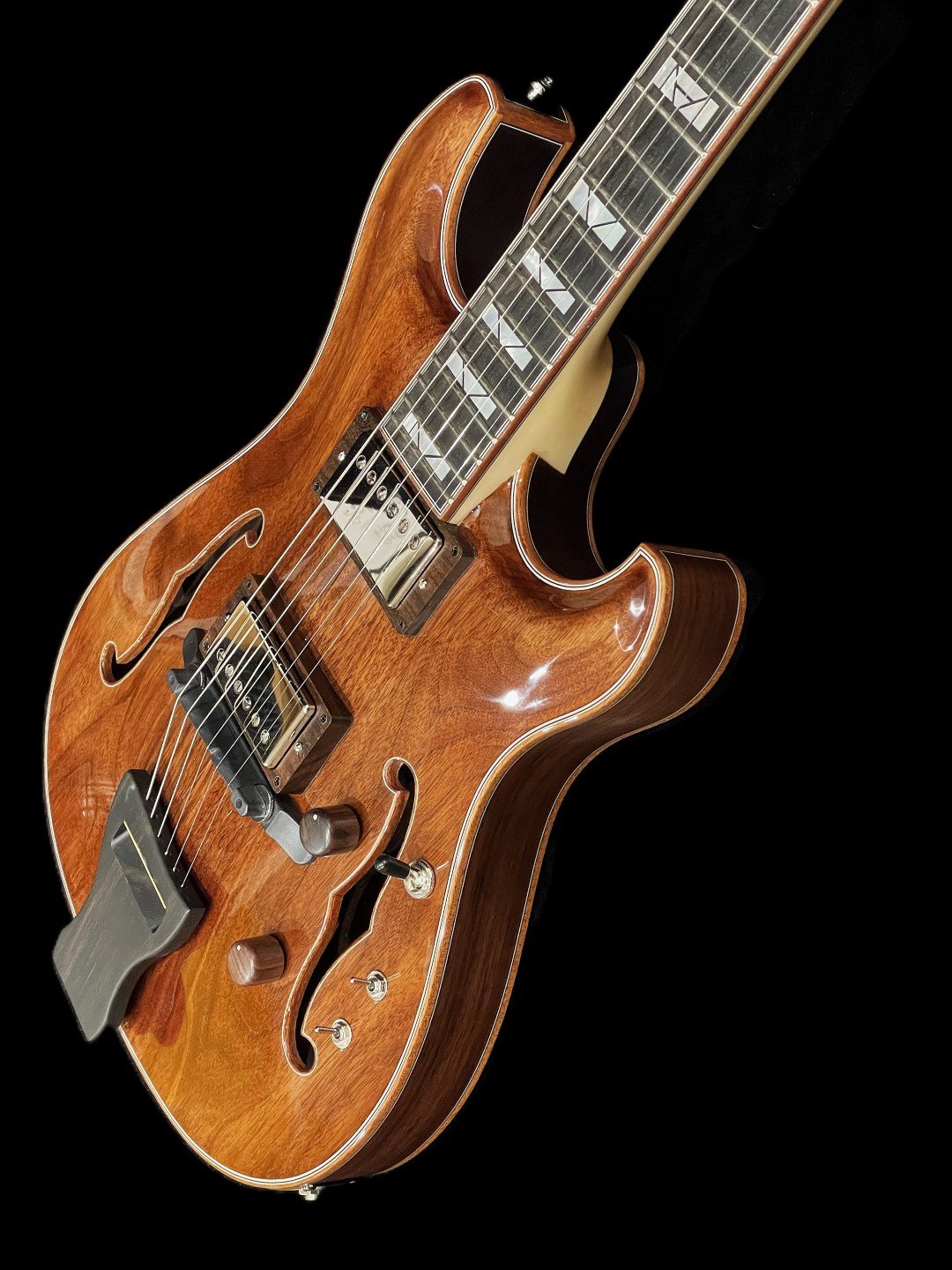 Historic archtop construction techniques including bracing and kerfing are used throughout, contributing to the guitarโs acoustic liveliness and dynamic response. Mahogany binding surrounds the body, neck, headstock, and F holes, framing the walnut beautifully while reinforcing the instrumentโs refined craftsmanship.