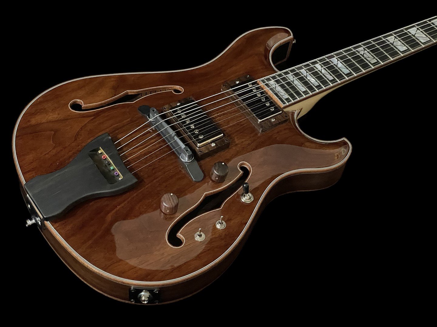 The Maxey Archtops GH1 Walnut is a 13 inch fully hollow archtop crafted from hand carved walnut with traditional construction methods and modern versatility. Featuring a three piece maple neck, 24 fret extended range, Seymour Duncan โ59 pickups with series, split, and parallel switching, and premium GraphTech hardware, the GH1 delivers rich acoustic resonance, exceptional playability, and a wide tonal palette in a compact, elegant instrument.