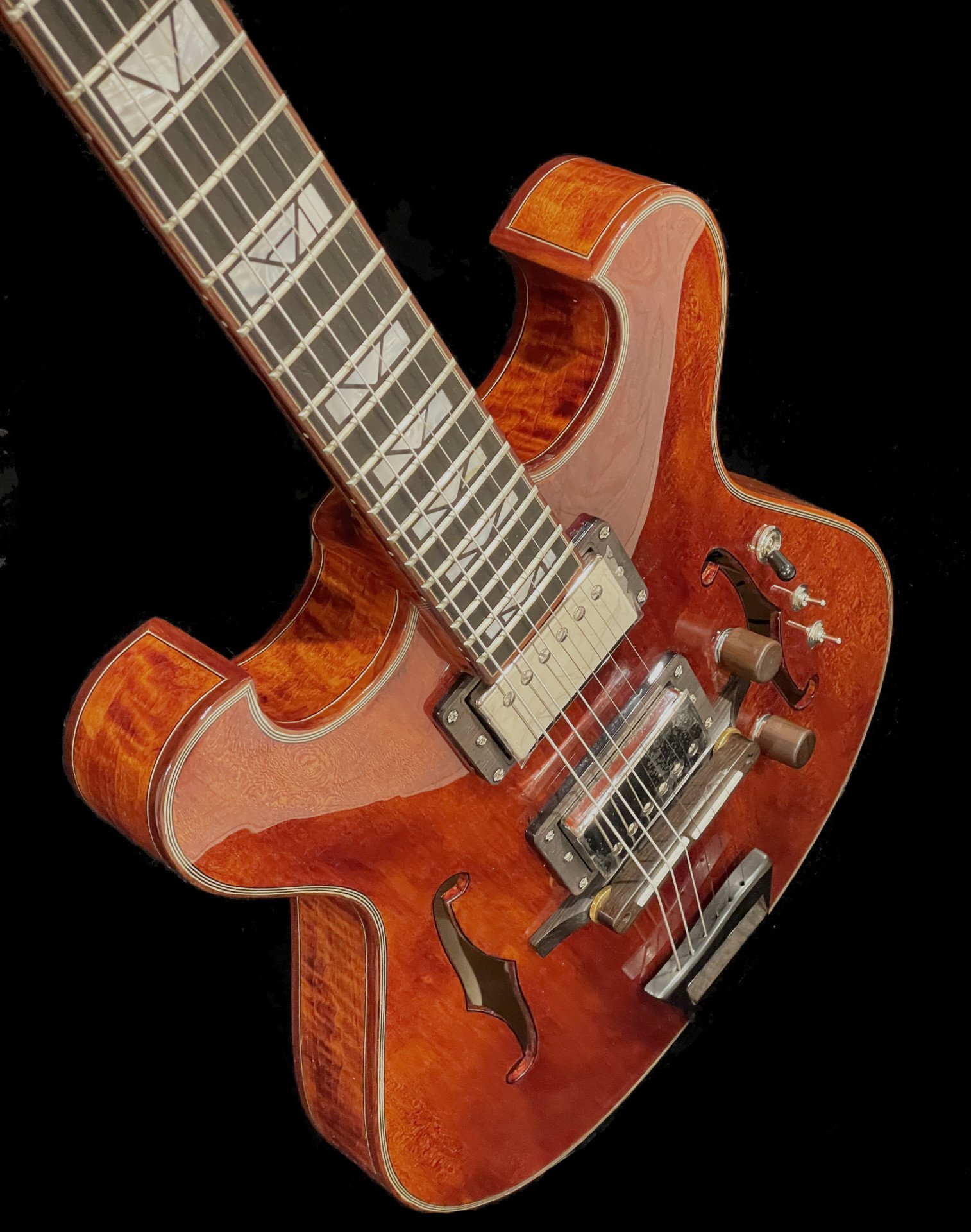 The Maxey Archtops Night Owl is a hand carved, small body, double cutaway guitar. Night Owl is available in spruce top with maple back and sides or curly maple top, back and sides. Available colors are Night Red or Sunburst. Electronics are gold & black. Every Night Owl features all solid wood selection, parallel bracing, kerfing, mahogany or maple binding, nitro finish, ebony fingerboard, tailpiece and floating bone saddle bridge. Itโs 24 fret neck with 25.5โ scale is designed to provide a clarity and pop to the notes while positioning the pickups exactly where we want for a balanced mix of high, low and mid while providing a truly sweet and expressive tone. Each Night Owl is equipped with Seymour Duncan โ59 humbuckers in series, parallel and split functions. The wooden volume/tone and switches will be positioned by the bridge and f-hole for easy control of a wide range of tones.